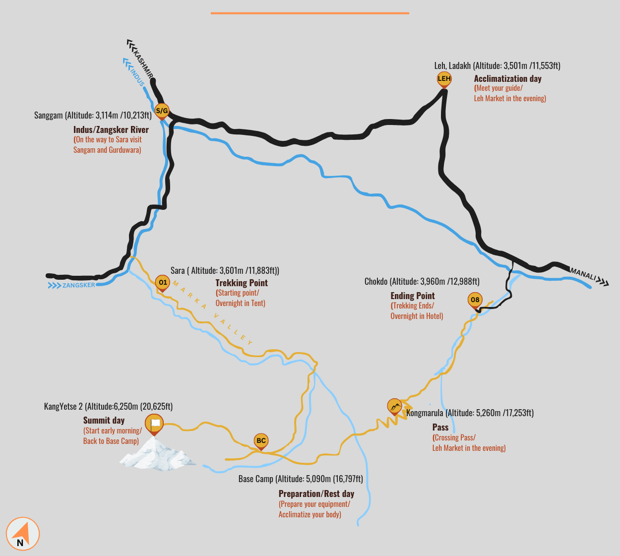 Mt. KangYatse is located in the Markha Valley which is in the Ladakh region. Mt. Kang Yatse 2 elevation 6250m is quite a popular peak after Stok Kangri. The Kang Yatse 2 difficulty to summit is quite technical but it is achievable trekking peak in Ladakh. It is a beautiful peak which goes through a marvelous Markha valley. Kang Yatse 2 best time to visit is in Summer (July August). Before you start your expedition we recommend doing some short trek in Ladakh like Sham Valley trek or one day trek from Gymtsa to Phyang. Markha valley trek is the usual way of getting there, as it provides a good acclimatization. There are some other ways to get the KangYatse 2 route. It will take you some 5 days to reach the base camp (5100m) Starting from 3500m approx and your body as well physically prepared for the Expedition